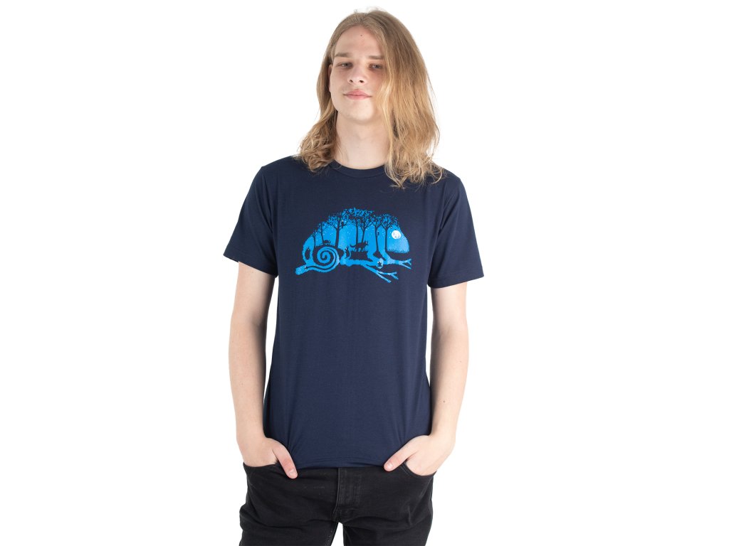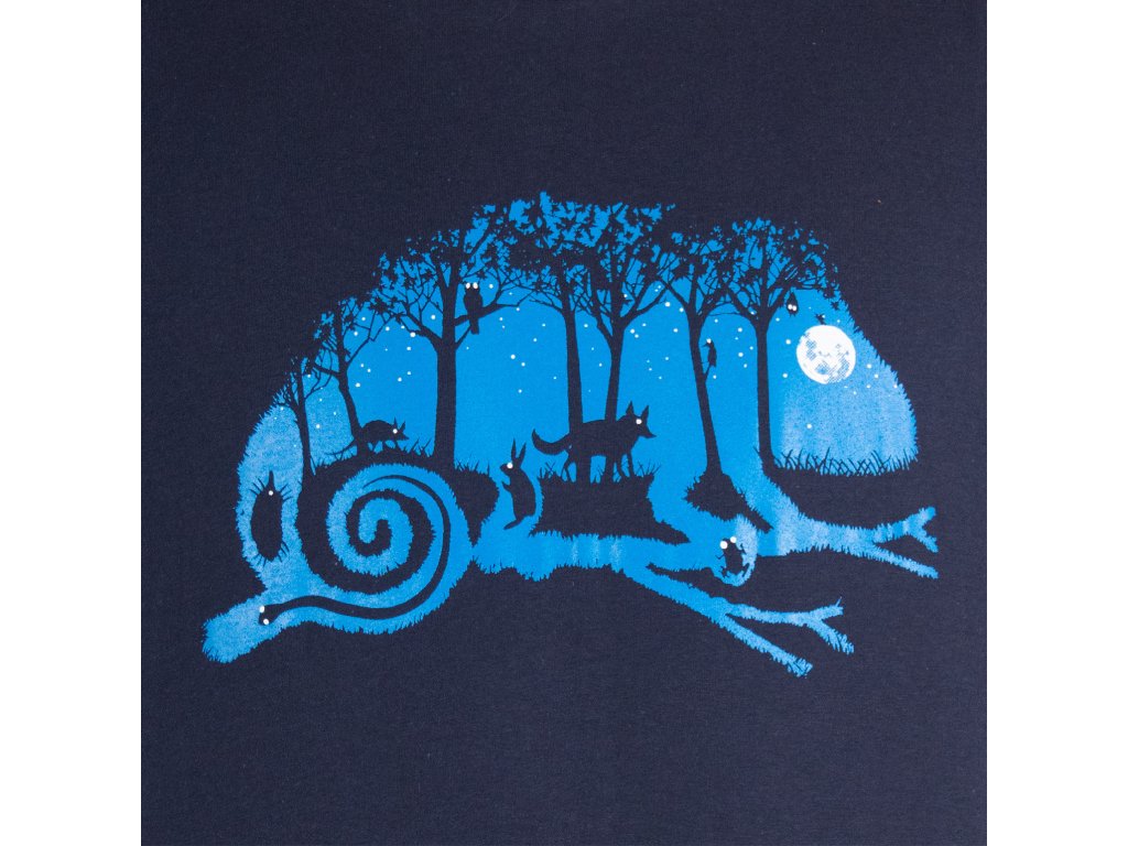 Tričko zobrazující noční život v lese za úplňku a to vše skrz chameleóna. 100% bavlna. Vyrobeno v Thajsku.